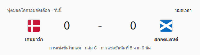 • หมดเวลาการแข่งขัน: เดนมาร์ก 0-0 สกอตแลนด์ เกมที่มีจังหวะหวาดเสียวมากมาย แต่จบแบบไร้สกอร์ แบ่งแต้มกันไปคนละหนึ่งคะแนน