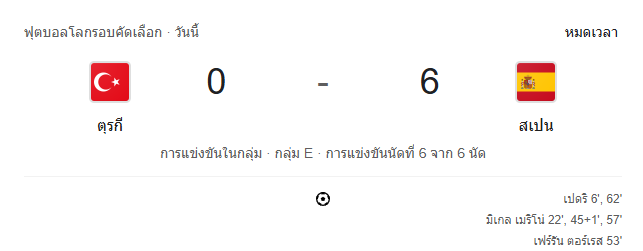 - นาทีที่ 93: จบเกม! ตุรกี 0-6 สเปน ทีมเยือนโชว์ฟอร์มสุดดุ บุกถล่มเจ้าถิ่นยับเยิน พร้อมฟอร์มสุดเฉียบจาก Mikel Merino (3 ประตู) และ Pedri (2 ประตู)