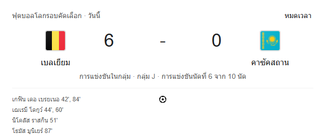 ผลบอลสด ฟุตบอลโลก 2026 รอบคัดเลือก โซนยุโรป กลุ่ม J ระหว่าง เบลเยียม 6-0 คาซัคสถาน วันนี้ 8/9/68