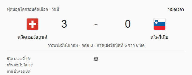 - นาทีที่ 94: จบเกม! สวิตเซอร์แลนด์ 3-0 สโลวีเนีย คว้าชัยแบบไร้ที่ติ!