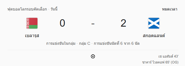 ผลบอลสด ฟุตบอลโลก 2026 รอบคัดเลือก โซนยุโรป กลุ่ม C ระหว่าง เบลารุส vs สกอตแลนด์ วันนี้ 9/9/68 ดูบอลย้อนหลัง คลิปไฮไลท์ ดูบอล ฟุตบอลโลก 2026 รอบคัดเลือก โซนยุโรป กลุ่ม C