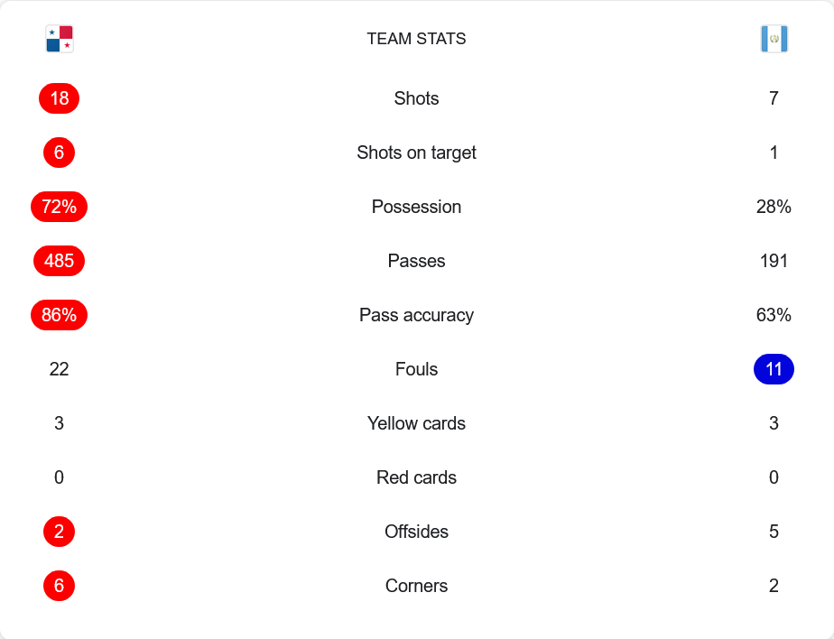 ตัวเลขบอกชัดเจนว่าปานามาครองเกมเหนือกว่าทุกด้าน มีโอกาสยิงถึง 18 ครั้ง เข้ากรอบ 6 ครั้ง ครองบอล 72% จ่ายบอลสำเร็จถึง 485 ครั้งด้วยความแม่นยำ 86% ขณะที่กัวเตมาลายิงได้เพียง 7 ครั้ง เข้ากรอบ 1 ครั้ง ครองบอลเพียง 28% แต่ยังสามารถยื้อผลเสมอได้สำเร็จ แถมเกมนี้ยังมีใบเหลืองรวมถึง 6 ใบ แสดงให้เห็นถึงความเดือดดาลในสนาม