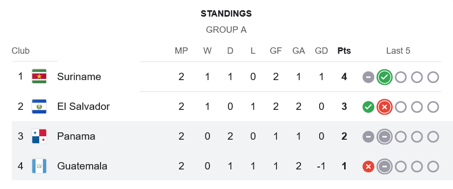 หลังเกมนี้ ปานามามี 2 คะแนนจากการเสมอสองนัด รั้งอันดับ 3 ของกลุ่ม A ขณะที่กัวเตมาลามี 1 คะแนนอยู่อันดับสุดท้าย ผลเสมอนี้ทำให้ทั้งสองทีมต้องเก็บชัยชนะในนัดต่อไปเพื่อมีลุ้นเข้ารอบ เพราะซูรินามและเอลซัลวาดอร์เริ่มโกยแต้มไปแล้ว