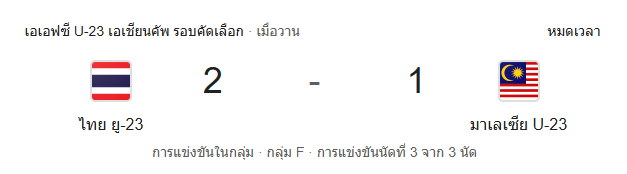 หมดเวลาการแข่งขัน ทีมชาติไทย U23 เฉือนชนะ มาเลเซีย U23 ไปแบบสุดมัน 2-1 จากสองประตูของ คคนะ คำยก พาทีมเก็บเพิ่มเป็น 7 แต้ม ผงาดคว้า แชมป์กลุ่ม F พร้อมตีตั๋วลุยศึก U23 Asian Cup รอบสุดท้ายที่ซาอุดิอาระเบีย ได้สำเร็จอย่างสมศักดิ์ศรี