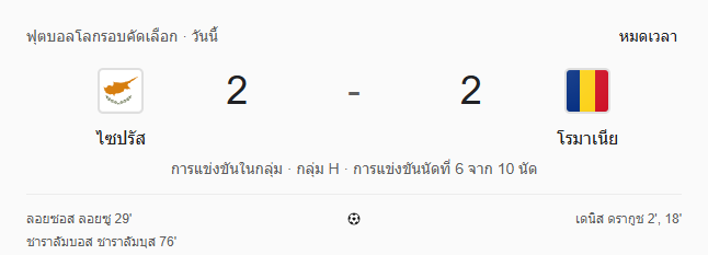ศึกฟุตบอลโลก 2026 รอบคัดเลือก โซนยุโรป กลุ่ม H ที่สนาม GSP สเตเดี้ยม, นิโคเซีย จบลงด้วยผลการแข่งขันที่แฟนบอลต้องจดจำเมื่อ ไซปรัส เปิดบ้านเสมอ โรมาเนีย 2-2 เกมนี้ บ้านกีฬา ขอนำเสนอ ผลบอลสด ที่เต็มไปด้วยดราม่า ความเข้มข้น และเหตุการณ์สำคัญที่พลิกไปพลิกมาแบบนาทีต่อนาที