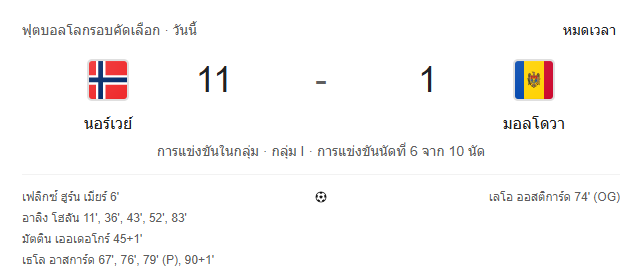 ในศึกฟุตบอลโลก 2026 รอบคัดเลือก โซนยุโรป กลุ่ม I ที่เพิ่งจบลงแบบสุดมันส์เมื่อคืนนี้ นอร์เวย์ระเบิดฟอร์มโหดเปิดบ้านถล่ม มอลโดวา แบบไม่ไว้หน้า 11-1 โดยมีชื่อ เออร์ลิ่ง ฮาลันด์ เป็นศูนย์กลางการสังหาร ด้วยผลงาน 4 ประตู และอีก 2 แอสซิสต์ แถม ผลบอลสด จากเกมนี้ก็สร้างความฮือฮาทั่วสนาม Ullevaal Stadium ณ กรุงออสโล ประเทศนอร์เวย์