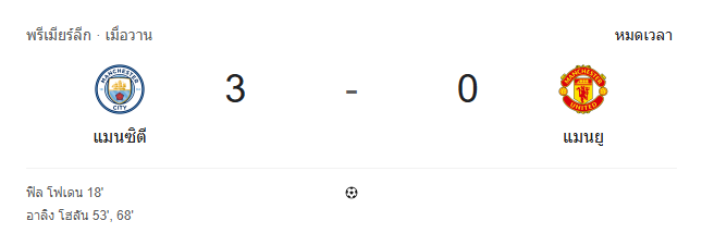ศึกแดงเดือดในศึกพรีเมียร์ลีก อังกฤษ ค่ำคืนวันที่ 14 กันยายน 2025 กลายเป็นฝันร้ายของฝั่ง “ปีศาจแดง” แมนเชสเตอร์ ยูไนเต็ด หลังพ่ายให้กับอริร่วมเมือง “เรือใบสีฟ้า” แมนเชสเตอร์ ซิตี้ แบบหมดรูป 3-0 ที่สนามเอติฮัด สเตเดียม โดยมี เออร์ลิง ฮาลันด์ เหมาสอง และ ฟิล โฟเดน ซัดประตูเปิดหัวอย่างสุดสวย เกมนี้คืออีกหนึ่งเกมที่คำว่า “ผลบอลสด” ไม่ได้บอกแค่ผลลัพธ์ แต่สะท้อนถึงความดุดันของแชมป์เก่าอย่างแท้จริง