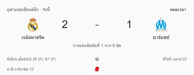 แม้จะโดนนำก่อนและต้องเล่น 10 คนในช่วงท้าย แต่ เรอัล มาดริด ก็ยังเฉียบคมพอเฉือนชนะ มาร์กเซย ไปได้ 2-1 จากสองประตูของ คีเลียน เอ็มบัปเป้ จากจุดโทษทั้งคู่ อีกฝั่ง เกโรนิโม่ รุลลี่ นายด่านมาร์กเซย โชว์เซฟมหากาฬตลอดทั้งเกม คว้ารางวัลผู้เล่นยอดเยี่ยมด้วยคะแนนสูงถึง 9.7!