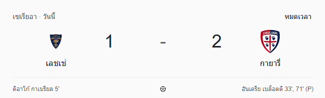 ผลบอลสด เซเรียอา ระหว่าง เลชเช่ 1-2 กาญารี่ วันนี้ 20/9/68