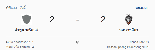 ในค่ำคืนที่แฟนบอลลำพูนและโคราชต้องจดจำไปอีกนาน บ้านกีฬา ขอนำเสนอศึกฟุตบอล ไทยลีก สุดมันส์ระหว่าง ลำพูน วอร์ริเออร์ เปิดบ้านรับการมาเยือนของ นครราชสีมา เอฟซี ผลจบลงด้วยสกอร์สุดดราม่า 2-2 แบ่งแต้มกันไปแบบสุดระทึก โดยเกมนี้มีเหตุการณ์สำคัญนาทีต่อนาทีที่คุณไม่ควรพลาด “ผลบอลสด“ มาให้คุณติดตามกันแบบถึงใจ