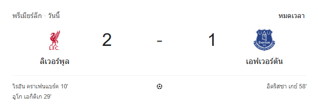 - นาทีที่ 94: จบเกม ลิเวอร์พูลเฉือนเอาชนะ เอฟเวอร์ตัน 2-1 คว้า 3 แต้มในศึกเมอร์ซีย์ไซด์ดาร์บี้!