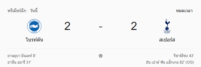 - นาทีที่ 96: จบเกม ไบรท์ตันเสมอสเปอร์ส 2-2 แบ่งแต้มสุดมัน!