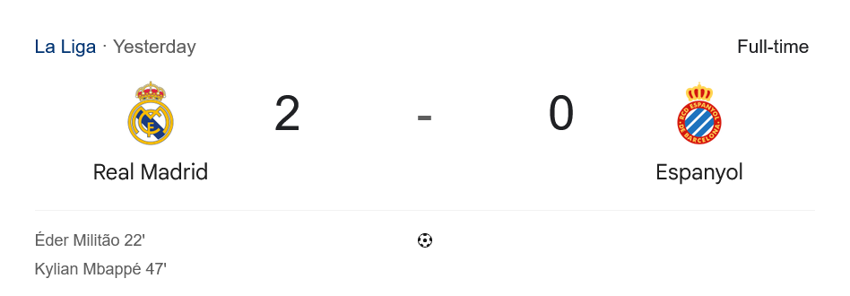 กลับมาครึ่งหลัง นาที 47 เอ็มบัปเป้ ยิงปิดบัญชีสุดเฉียบขาดหลังได้บอลจากวินิซิอุส ซัดเต็มข้อเสียบตาข่ายให้มาดริดหนีห่าง 2-0 เกมจากนั้นเอสปันญ่อลพยายามเปิดเกมสู้ มีโอกาสบ้างแต่ไม่คมพอ แถมโดนบีบพื้นที่ตลอด จนกระทั่งครบ 90 นาที ไม่มีสกอร์เพิ่มเติม จบเกมราชันชุดขาวเก็บชัยชนะสำคัญเหนือคู่แข่งไปได้แบบไม่ยากเย็น