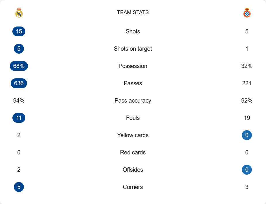มาดริดครองบอลเหนือกว่าแบบชัดเจนถึง 68% ผ่านบอลมากกว่า 600 ครั้งและแม่นยำถึง 94% ขณะที่เอสปันญ่อลมีเพียง 32% พยายามยิงแค่ 5 ครั้งเข้ากรอบ 1 ครั้ง ตรงข้ามกับเจ้าบ้านที่มีโอกาสยิง 15 ครั้งเข้ากรอบ 5 เกมนี้สะท้อนคุณภาพของทีมอย่างชัดเจน แม้เอสปันญ่อลจะวิ่งสู้ฟัด แต่ไม่สามารถกดดันแนวรับของมาดริดได้เลย