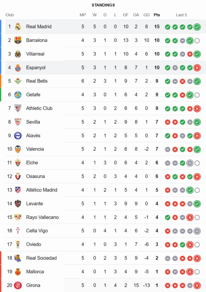 ชัยชนะนัดนี้ส่ง เรอัล มาดริด เก็บ 15 คะแนนเต็มจาก 5 นัด นั่งจ่าฝูงแบบสง่างามเหนือบาร์เซโลน่า 5 แต้ม (แข่งมากกว่า 1 นัด) ขณะที่ เอสปันญ่อล แม้จะแพ้ แต่ยังเกาะอันดับ 4 ของตาราง มี 10 แต้มจาก 5 นัด ถือว่ายังอยู่ในเส้นทางลุ้นพื้นที่ยุโรป