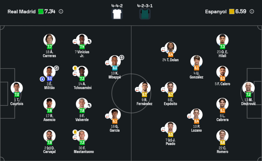 เกมนี้มาดริดโชว์มาตรฐานสูงสุดสมทีมลุ้นแชมป์ ระบบ 4-4-2 สลับกับ 4-3-3 ยืดหยุ่นเต็มที่ ครองบอล 68% ใช้การประสานงานริมเส้นและการสอดขึ้นของบัลเบร์เด้เติมเต็มเกมรุก การป้องกันก็คุมแน่น มิลิเตายืนคุมแผงหลังได้แข็งแกร่งจนเอสปันญ่อลแทบไม่หาช่องเจาะได้ ส่วนเอสปันญ่อลแม้จะพยายามตั้งรับแน่นและหาจังหวะสวนกลับ แต่การผ่านบอลไม่แม่นพอและเกมรุกขาดความเฉียบคม บ้านกีฬา มองว่ามาดริดยังคงเครื่องจักรที่ครบทั้งรุกและรับ สมราคาทีมเต็ง
