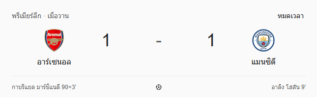- จบเกม: อาร์เซนอลเปิดบ้านเสมอแมนเชสเตอร์ ซิตี้ 1-1 แบ่งแต้มสุดมัน