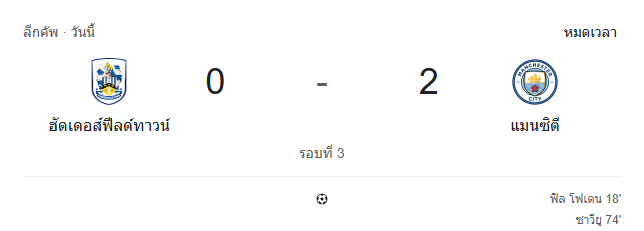 ศึกคาราบาวคัพรอบที่ 3 จบลงด้วยชัยชนะของ “เรือใบสีฟ้า” แมนเชสเตอร์ ซิตี้ ที่บุกอัดเจ้าถิ่น ฮัดเดอร์ฟิลด์ ทาวน์ แบบไม่ไว้หน้า 2-0 คว้าตั๋วเข้าสู่รอบถัดไปได้ตามคาด พร้อมกับโชว์ฟอร์มสุดคมจาก ฟิล โฟเด้น ที่ยิงหนึ่ง จ่ายหนึ่ง อย่างโหด และแน่นอนว่า บ้านกีฬา ไม่พลาดที่จะนำ ผลบอลสด และไฮไลต์สำคัญมาฝากกันแบบเต็มๆ!