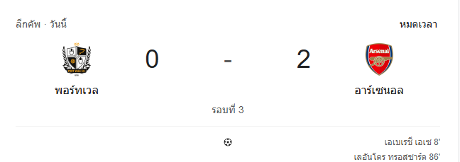 - นาทีที่ 95: หมดเวลาการแข่งขัน: อาร์เซน่อลคว้าชัยชนะเหนือพอร์ทเวล 2-0 แบบคุมเกมอยู่หมัด
