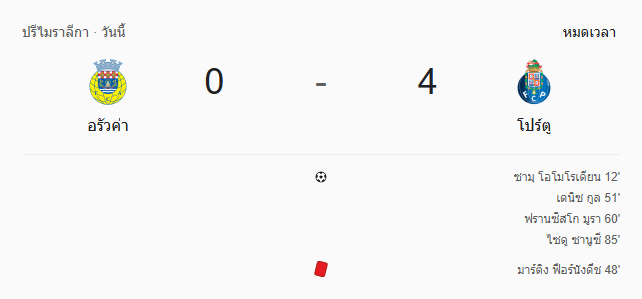 - นาทีที่ 94: จบเกม! อารัวค่า 0-4 เอฟซี ปอร์โต้ ปอร์โต้เก็บ 3 แต้มได้ตามเป้าหมายอย่างสวยงาม