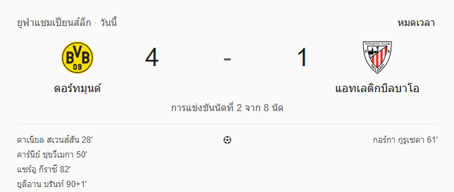 - จบครึ่งแรก: ดอร์ทมุนด์ 1 – 0 บิลเบา