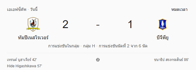 แทมปิเนส โรเวอร์ส โชว์ความเด็ดขาดในจังหวะเข้าทำและการป้องกันที่รัดกุม คว้า 3 คะแนนสำคัญเหนือ บีจี ปทุม ยูไนเต็ด ไปได้ 2-1 ส่งผลให้สถานการณ์กลุ่ม H ยิ่งเข้มข้น ส่วนบีจีต้องเร่งแก้ไขเกมรับหากหวังลุ้นเข้ารอบต่อไป