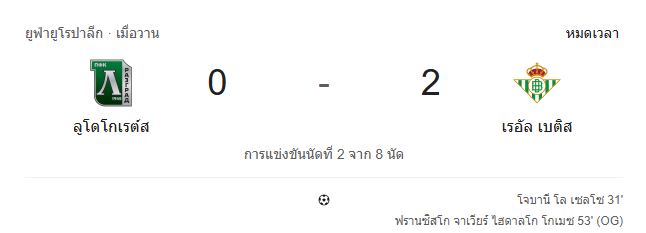 - จบครึ่งแรก: ลูโดโกเรตส์ 0 – 1 เรอัล เบติส