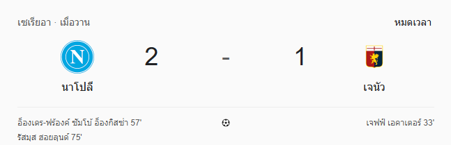 • หมดเวลา: นาโปลีคว้า 3 แต้มในบ้านด้วยการแซงชนะเจนัว 2-1