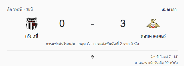 - นาทีที่ 96: หมดเวลา! ดอนคาสเตอร์ โรเวอร์ส บุกถล่ม กริมสบี้ ทาวน์ 3-0 เก็บสามแต้มเต็มในเกมรอบแบ่งกลุ่มได้อย่างยอดเยี่ยม โดยมี Robbie Gotts เหมาสองและอีกหนึ่งลูกจากความผิดพลาดของแนวรับเจ้าบ้าน