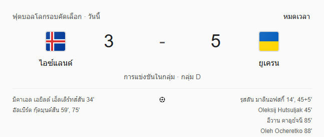- หมดเวลา: 🇮🇸 ไอซ์แลนด์ 3–5 🇺🇦 ยูเครน เกมนี้สนุกเร้าใจ ยิงรวมถึง 8 ประตู ยูเครนพลิกกลับมาชนะหลังโดนนำในช่วงต้นครึ่งหลัง