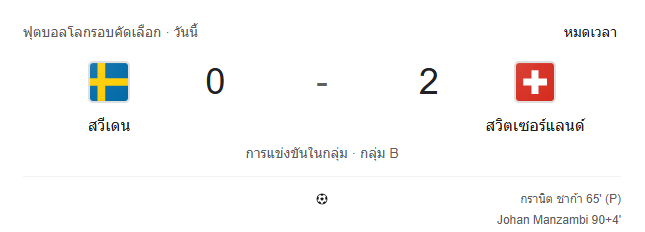 • หมดเวลา: 🇸🇪 สวีเดน 0–2 🇨🇭 สวิตเซอร์แลนด์