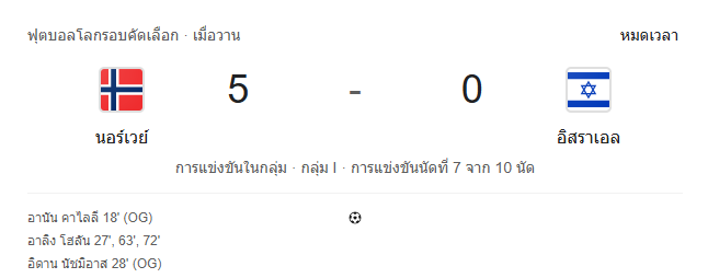 - หมดเวลา: นอร์เวย์ 5-0 อิสราเอล