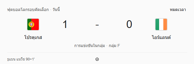 - หมดเวลา: โปรตุเกส 1-0 ไอร์แลนด์
