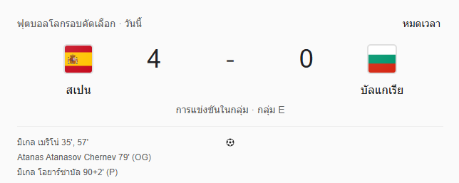 - นาทีที่ 94: หมดเวลา! 🔚 จบเกม สเปนถล่มบัลแกเรีย 4–0 คว้าชัยชนะอย่างสวยงามในเกมคัดบอลโลก