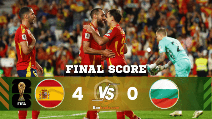 สเปนเก็บเพิ่มอีก 3 แต้มเต็ม มี 12 คะแนนเต็มจาก 4 นัด ยิงรวม 15 ประตู ไม่เสียแม้แต่ลูกเดียว! ยึดจ่าฝูงกลุ่ม E อย่างแข็งแกร่ง ขณะที่ บัลแกเรีย แพ้รวด 4 นัด ยิงได้เพียง 1 เสียถึง 16 รั้งบ๊วยแบบไม่มีข้อแก้ตัว