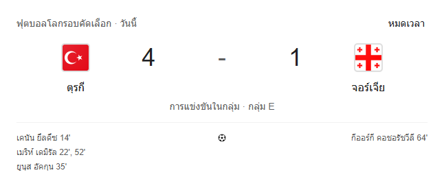- นาทีที่ 95: หมดเวลา! 🔚 จบเกม ตุรกี 4–1 จอร์เจีย ทีมเจ้าบ้านโชว์ฟอร์มสุดร้อนแรงโดยมี เดมิรัล เหมาคู่ และ ยิลดิซ เปิดหัวก่อนปิดเกมสวยงาม