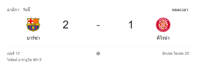 - นาทีที่ 95: หมดเวลา! บาร์เซโลนา 2-1 คิโรนา ทีมเจ้าบ้านเฉือนชัยสุดระทึกในช่วงทดเจ็บจากประตูของ อเราโฆ หลังโดนตีเสมอในครึ่งแรก