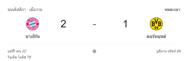 • นาทีที่ 96: หมดเวลา! จบเกมที่ บาเยิร์น มิวนิค เฉือนเอาชนะ โบรุสเซีย ดอร์ทมุนด์ ไปได้อย่างสนุก 2-1! เสือใต้เก็บสามแต้มสำคัญในบ้านได้สำเร็จ!