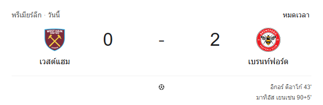 - หมดเวลา: เบรนท์ฟอร์ดบุกชนะ เวสต์แฮม 2-0 ได้ประตูจาก อิกอร์ ติอาโก้ (น.43) และ เยนเซน (น.90+5) ขณะที่เจ้าบ้านเล่นได้ดีแต่ไร้ความเฉียบคม