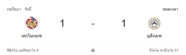 - หมดเวลา: เครโมเนเซเสมอ อูดิเนเซ 1-1 แม้เริ่มนำเร็วตั้งแต่นาทีที่ 4 แต่โดนตีเสมอช่วงต้นครึ่งหลังจาก ซานิโอโล่ ทำให้แบ่งแต้มกันไป