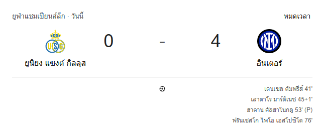 • หมดเวลา: 🔚 อินเตอร์ มิลาน บุกถล่ม ยูนิยง แซงต์-ชิลลัวส์ 4–0! เกมเหนือชั้นตั้งแต่ต้นจนจบ เก็บสามแต้มสำคัญในรอบแบ่งกลุ่มได้อย่างสวยงาม