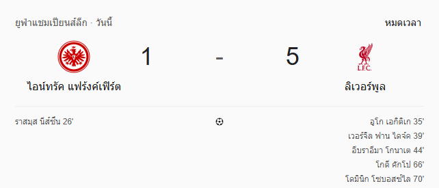 • หมดเวลา: 🔚 ไอน์ทรัค แฟรงค์เฟิร์ต 1–5 ลิเวอร์พูล