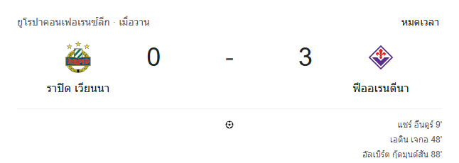 - จบเกม: 🔚 ราปิด เวียนนา 0–3 ฟิออเรนตินา ฟิออเรนตินาโชว์ฟอร์มเหนือชั้นจากประตูของ