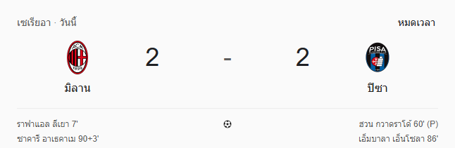 ศึกฟุตบอล กัลโช่ เซเรียอา อิตาลี คืนวันที่ 25 ตุลาคม 2025 ที่สนามซานซีโร่ “เอซี มิลาน” ทีมจ่าฝูงของลีก เปิดรังรับมือ “ปิซ่า” ทีมบ๊วยของตาราง แต่ผลการแข่งขันกลับไม่เป็นไปตามคาด หลัง รอสโซเนรี่ ต้องเหนื่อยจนถึงวินาทีสุดท้าย กว่าจะไล่ตีเสมอได้สำเร็จ 2-2 โดยบ้านกีฬาเกาะติด ผลบอลสด แบบนาทีต่อนาที เกมนี้เต็มไปด้วยความมัน ดราม่า และอารมณ์สุดเข้มข้นตั้งแต่ต้นจนจบ