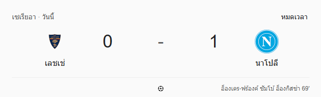 - 🔚 หมดเวลา: เลชเช่ 0-1 นาโปลี แฟรงก์ อ็องกิสซ่า เป็นฮีโร่ โหม่งประตูชัยพาทีมเก็บ 3 แต้มสำคัญกลับบ้าน
