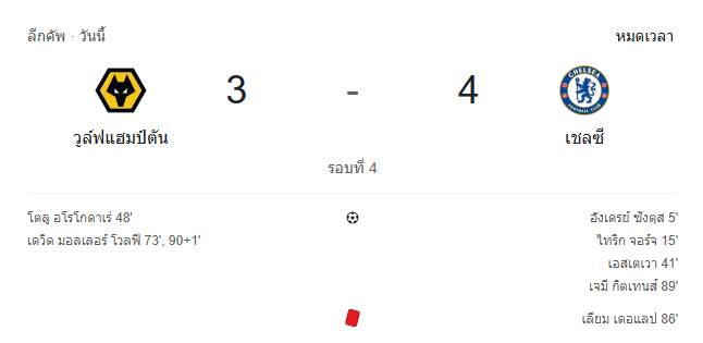 - หมดเวลา: วูล์ฟแฮมป์ตันต่อกรสุดมันส์แต่พ่ายเชลซี 3-4