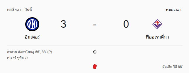 • หมดเวลา: อินเตอร์ มิลาน เอาชนะ ฟิออเรนตินา 3-0