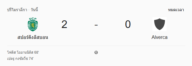 - หมดเวลา: สปอร์ติ้ง ลิสบอน เอาชนะ อัลเวร์กา 2–0 คว้าชัยด้วยฟอร์มเหนือกว่าอย่างชัดเจนทั้งเกม