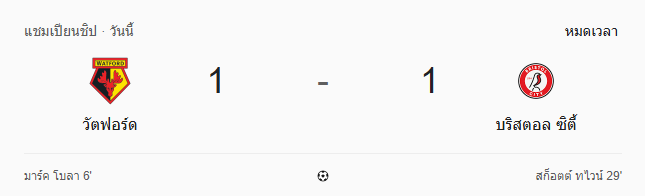 - หมดเวลา: จบเกม! วัตฟอร์ด 1-1 บริสตอล ซิตี้ แบ่งแต้มกันไปในเกมที่ผู้รักษาประตูทั้งสองฝั่งโชว์ฟอร์มสุดยอด
