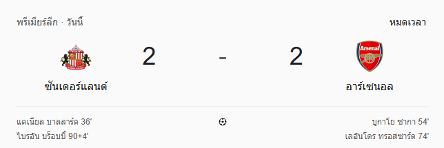 ผลบอลพรีเมียร์ลีก อาร์เซน่อลโดนซันเดอร์แลนด์ยิงทดเจ็บ! เสมอสุดเดือด 2-2 พลาดสามแต้มทอง